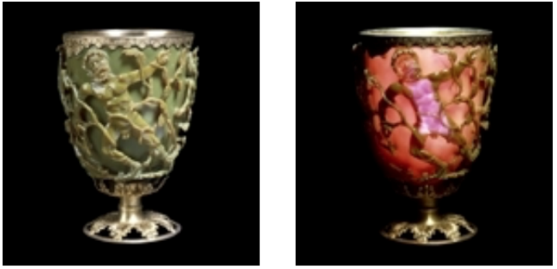 早在4世纪,古罗马就制造出了会变色的莱克格斯杯(Lycurgus Cup),当光线从外面照射时,玻璃杯呈暗绿色; 当光线从里面照射,玻璃杯是亮红色的。这是因为用到了金和银的纳米颗粒。还有欧洲教堂斑斓的彩绘玻璃,其实是各种各样的纳米氧化物在起作用。日常所用的口红中也含有纳米。