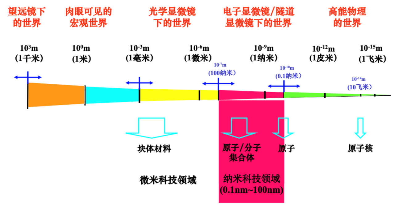 人类认识世界,是向宏观和微观两个极端进军的过程。从微米科技到纳米科技,是科学发展的必然结果,是人类认识世界过程中的必然阶段。再往前走,纳米的千分之一是皮米(10-12米),可以分辨出原子核、质子,研究原子里面的东西。那里的能量已经大到难以想象了。再往前走还有飞米(10-15米),那是高能物理的世界。