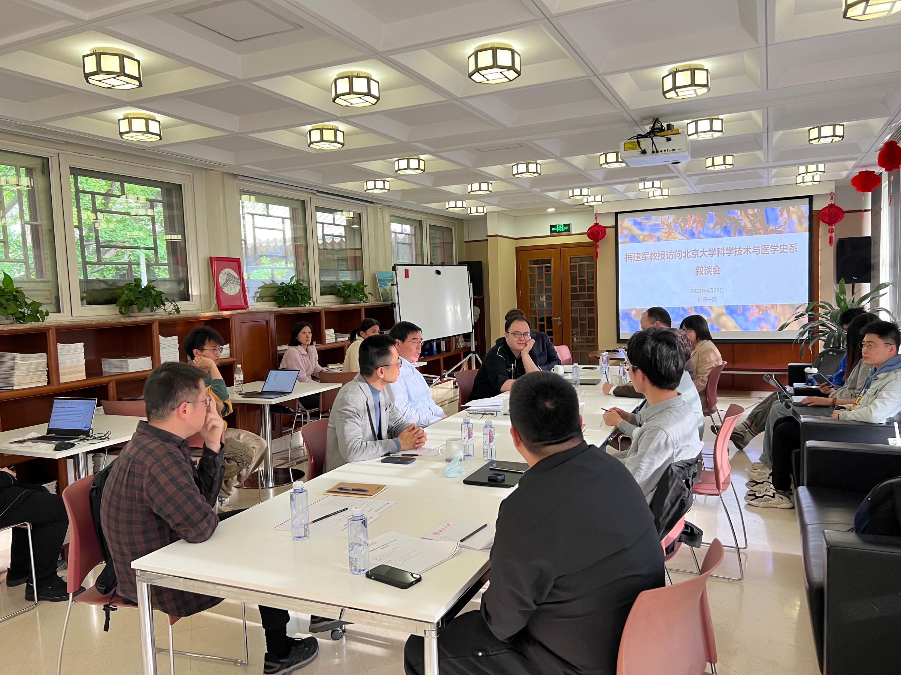 2023年4月26日下午,剑桥大学麦克唐纳考古研究所研究员、剑桥大学丘吉尔学院院士、剑桥李约瑟研究所所长梅建军教授访问北京大学科学技术与医学史系。科技医史系教师张藜和陈昊、雷震、马大年、张蒙、曹琪,博士后马志谦、张井飞、鲁世林,系办朱艳美、俞晓盈、侯君梅、张雪梅,以及系部分博硕士研究生参加了此次在静园一号院201举行的交流活动。