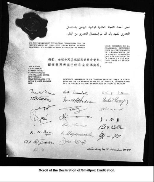 “我们,全球扑灭天花证实委员会委员,证实扑灭天花已经在全世界实现。”