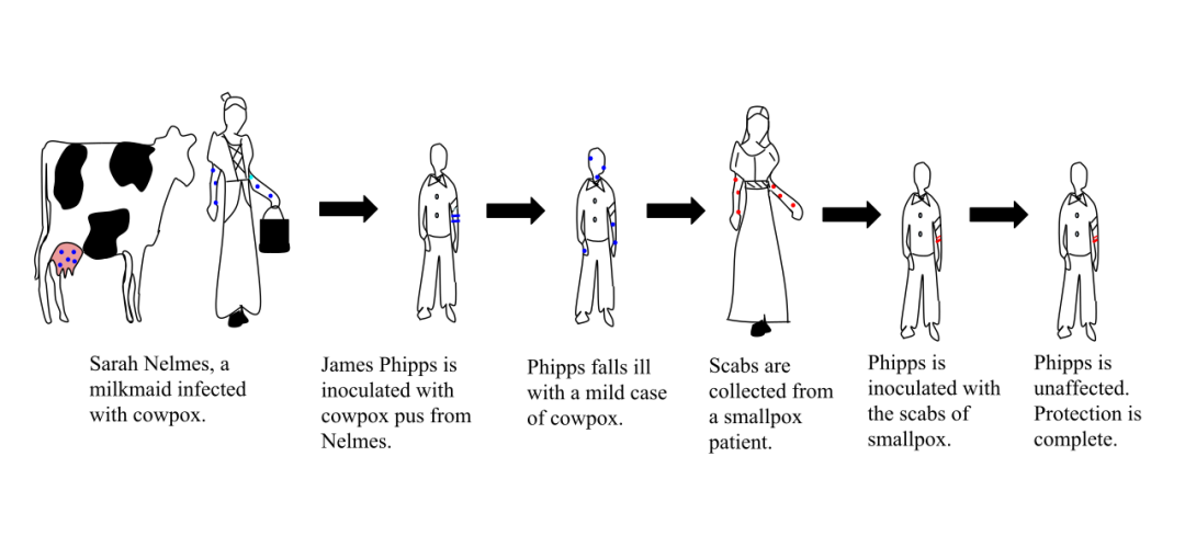 1796年5月14日,积累了丰富行医经验的詹纳给8岁的菲普斯(James Phipps)接种了牛痘,痘苗取自一位挤奶女工。菲普斯出现局部反应,几天后就完全恢复了。为了检验牛痘的保护作用,同年7月,他为菲普斯接种了取自人类天花疮的物质,结果是成功的。