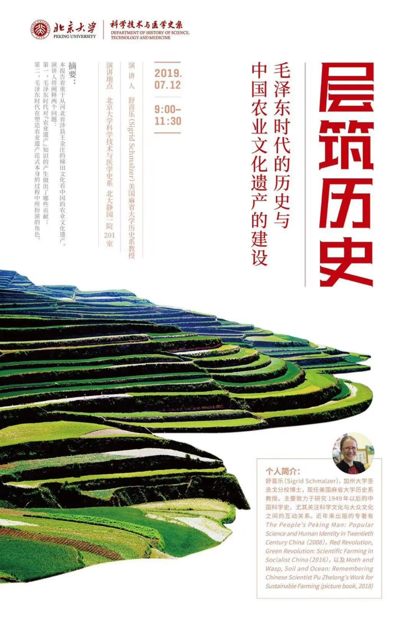 本系列讲座以报告人主讲,参会人讨论的方式举行,每两周举行一次,我系将陆续邀请国内外教授学者来系演讲。2019年该系列讲座尚在酝酿筹备中,已于当年7月邀请麻省大学安姆斯特分校历史系教授Sigrid Schmalzer(舒喜乐)来校演讲,主题“层筑历史:毛泽东时代的历史与中国农业文化遗产的建设”,为该系列讲座首讲。