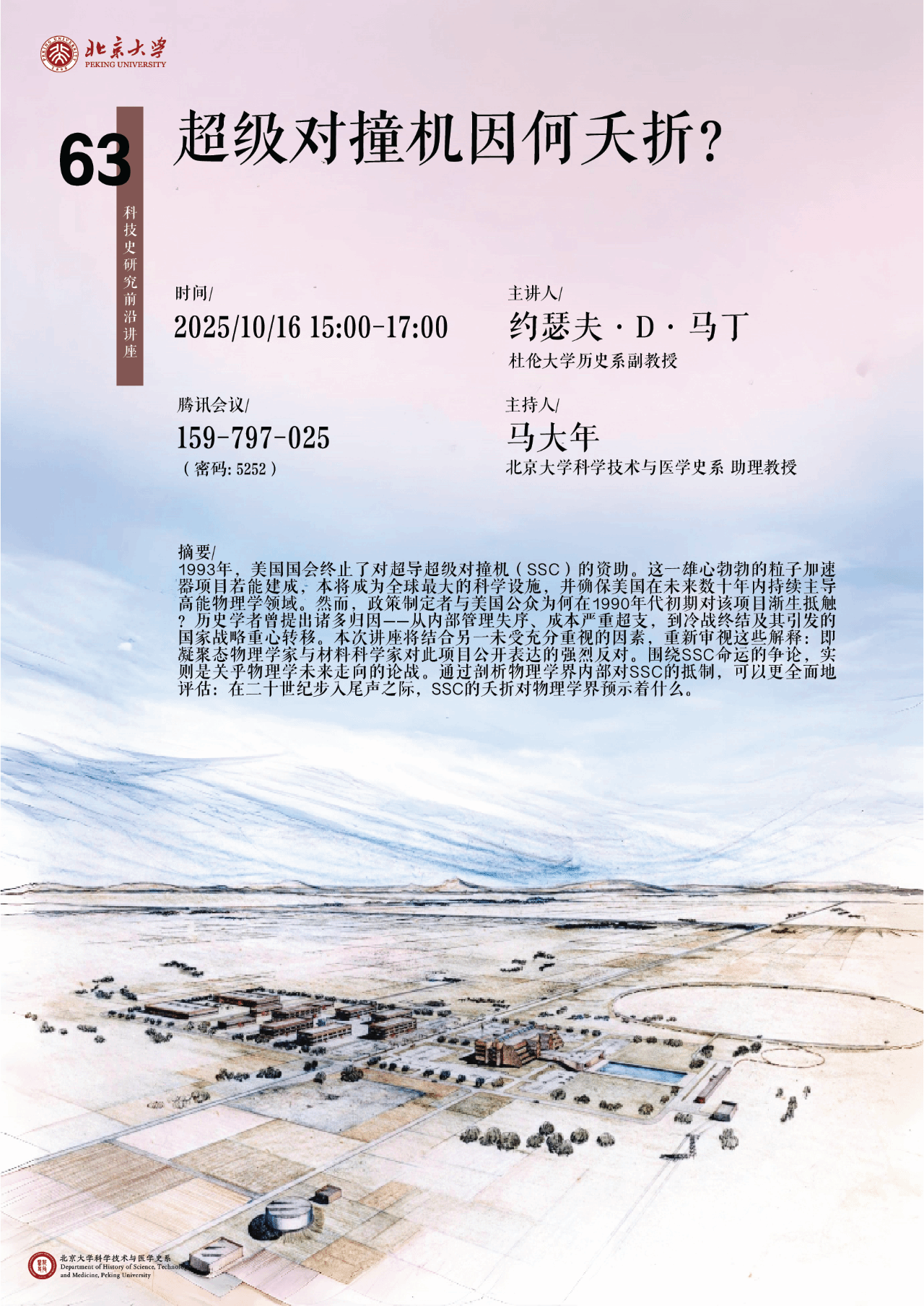 1993年,美国国会终止了对超导超级对撞机(SSC)的资助。这一雄心勃勃的粒子加速器项目若能建成,本将成为全球最大的科学设施,并确保美国在未来数十年内持续主导高能物理学领域。然而,政策制定者与美国公众为何在1990年代初期对该项目渐生抵触?历史学者曾提出诸多归因——从内部管理失序、成本严重超支,到冷战终结及其引发的国家战略重心转移。本次讲座将结合另一未受充分重视的因素,重新审视这些解释:即凝聚态物理学家与材料科学家对此项目公开表达的强烈反对。围绕SSC命运的争论,实则是关乎物理学未来走向的论战。通过剖析物理学界内部对SSC的抵制,可以更全面地评估:在二十世纪步入尾声之际,SSC的夭折对物理学界预示着什么。
