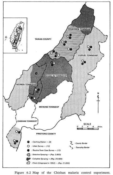 WHO在1956年派出了三位专家前往高雄,并在台湾疟疾研究所(Taiwan Malaria Research Institute, TMRI)的合作下在旗山(今台湾省高雄市东北部辖区)开展了一项基于统计学的疟疾控制实验。如图3所示,旗山被分成三个区域,深灰色地区为全面喷洒DDT的区域,浅灰色为选择性喷洒,白色地区不喷洒。就如同Sydenstricker在卡特罗格斯县所开展的实验一样,在旗山的实验也并未按照预想的方向发展。由于未喷洒DDT地区的居民(地图白色部分)抗议他们被排除在外,因此这一对照试验仅仅持续了短短几个月就结束了,这导致了数据收集是不完整的。尽管如此,这份数据仍然使得WHO批准在台湾喷洒DDT作为控制疟疾的手段。