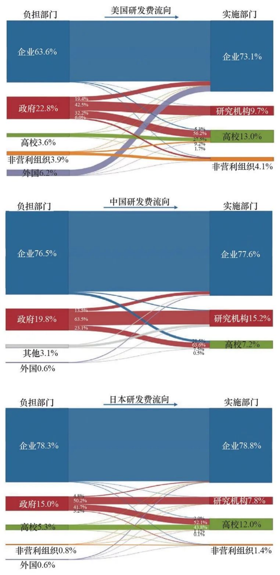 ▲美、中、日2017年研发经费流向