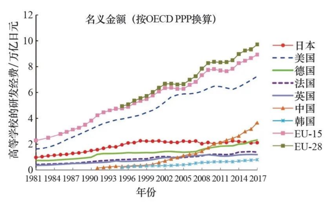 2010年以前,中国高等学校实施的研发经费一直低于日本,近年虽然有所增加,但截至2016年仍只比日本高出1/3。而中国高等院校实施的研发经费至今仍未达到美国的一半。