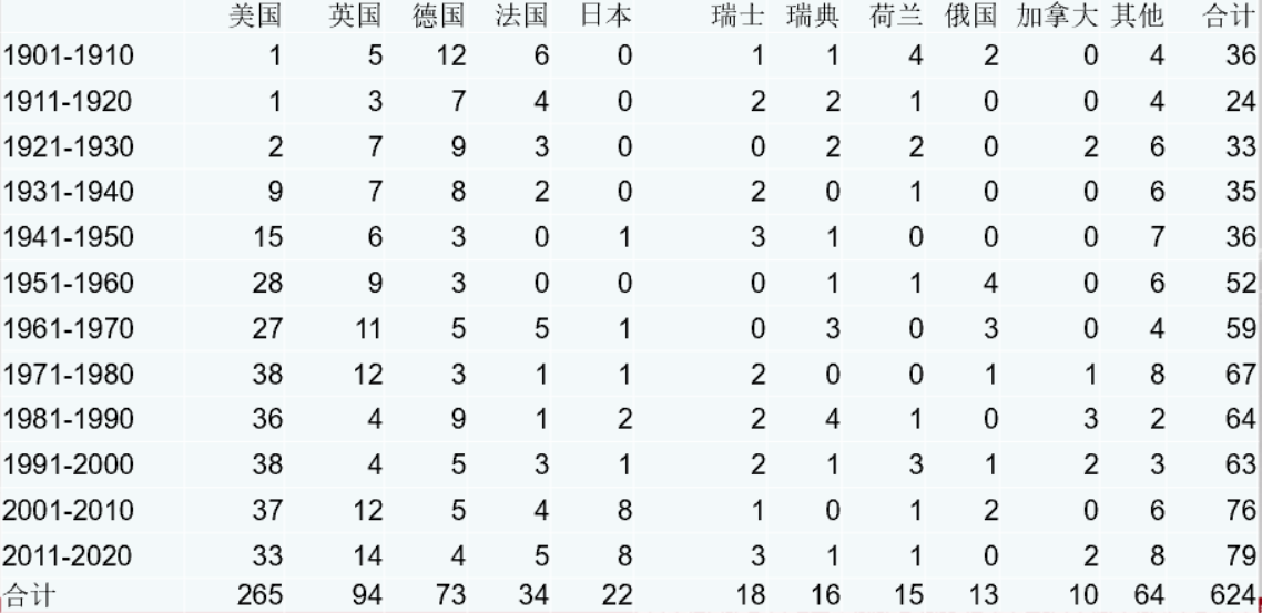 上面这张表格揭示了1901-2020年间主要国家的诺贝尔物理学奖、化学奖、生理学或医学奖的获奖人次。