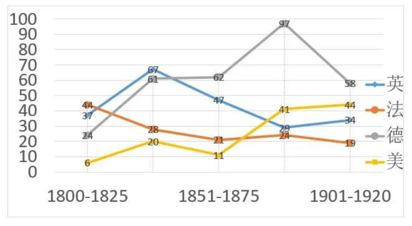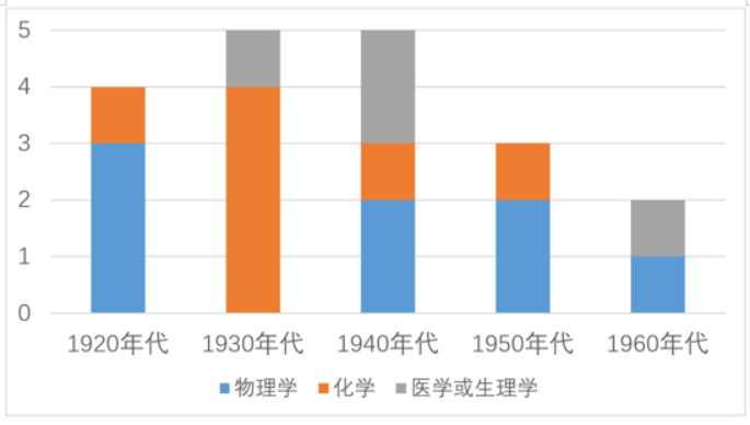 从这张折线图中可以看出,诺贝尔科学奖的获奖人数呈上升趋势,战后每个时段的获奖总人数均高于战前的各个时段。逐年检查诺贝尔科学奖颁奖数据时会发现,战前,一个奖项一般只颁发给一个人;战后,2个或3个人分享同一奖项的情形有很多,以致战后每个时段的获奖人数都明显高于战前。