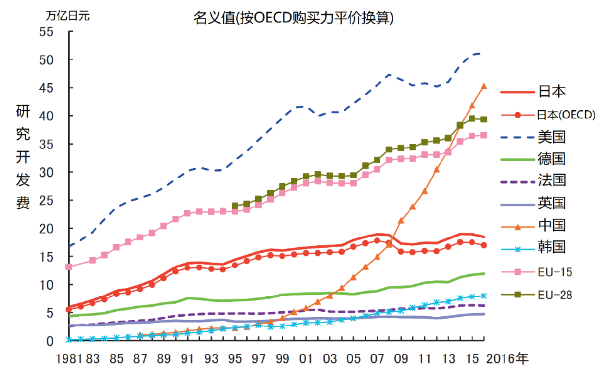 ▲1981-2016年间主要国家研发经费投入情况