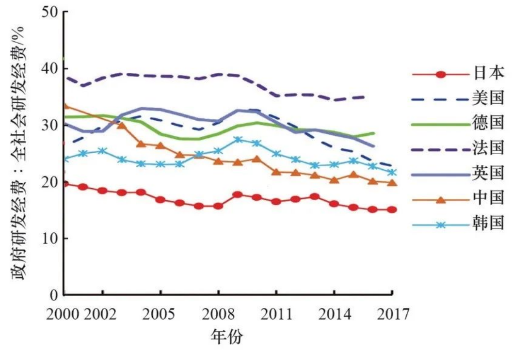 ▲主要国家政府研发经费占全社会研发经费的比重变动情况